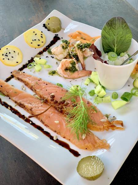 crevettes mayonnaise, sauce basilic ou fromage de chèvre et ricotta, petits croûtons et jambon cru ou moules sauce tomate/parmesan