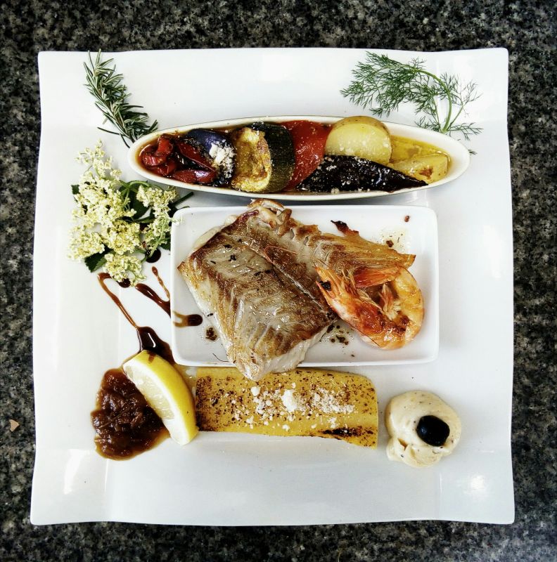 filet de lieu noir grillé à la plancha, caponata au four (aubergines, tomates, oignons, olives, câpres), rouille toulonnaise, polenta 21€